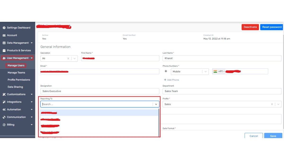 Kylas offers Hierarchy Management with the ‘Reporting To’ feature that allows leaders and managers in higher hierarchy roles to view the data of their direct and indirect reports within the organizations. With this feature, sales managers can easily access the data of their sales executives without requiring the executives to manually share their data.
